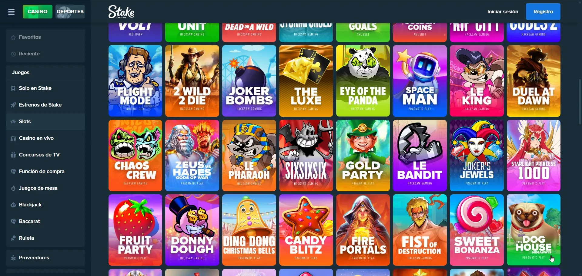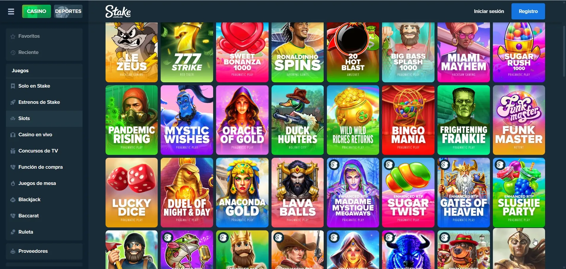 Nuestro equipo probó y analizó la oferta de juegos disponible para usuarios en Argentina y catalogó los proveedores y categorías más relevantes. Stake combina títulos de grandes estudios con su propio catálogo “Stake Originals” (Crash, Plinko, Dice, Mines y variantes), más una amplia cartera de slots y mesas de proveedores comerciales.