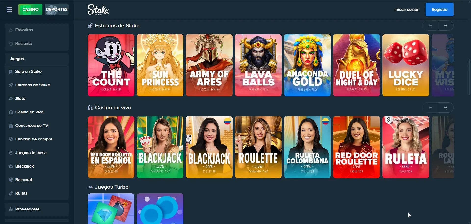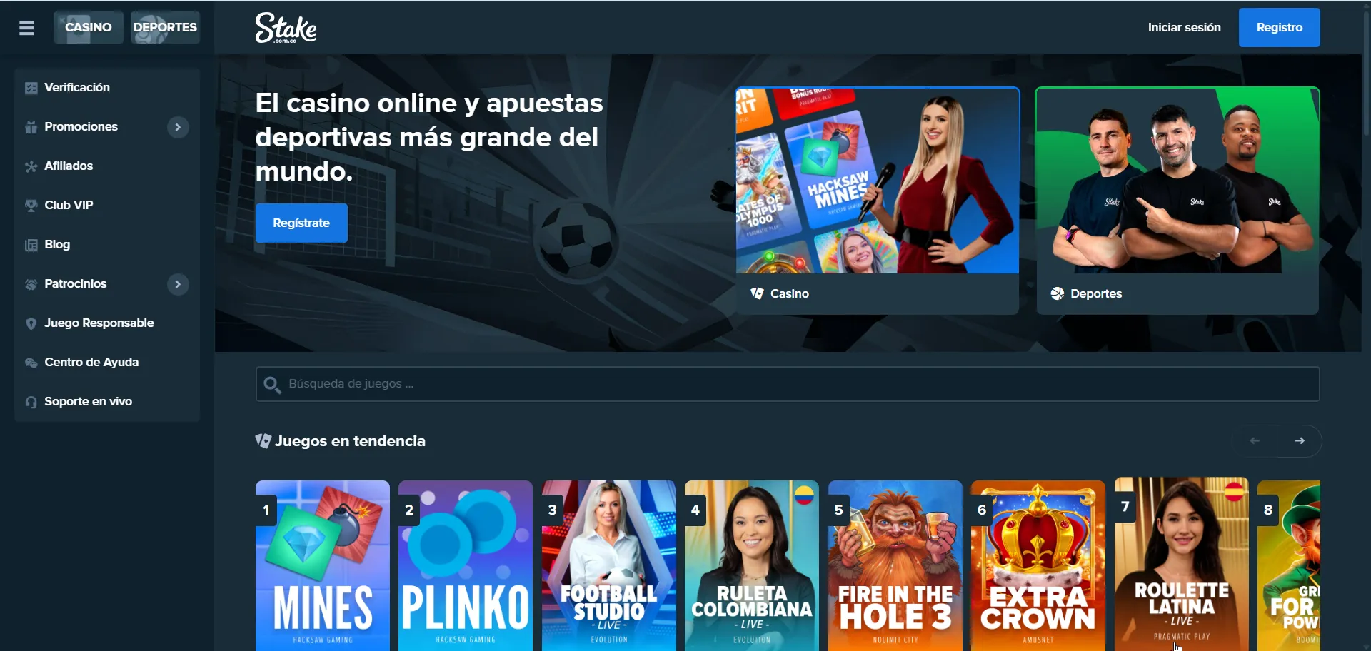 | Productos destacados | Stake Originals (Plinko, Crash, Mines, Dice), casinos con juegos provably fair, sección de apuestas deportivas |